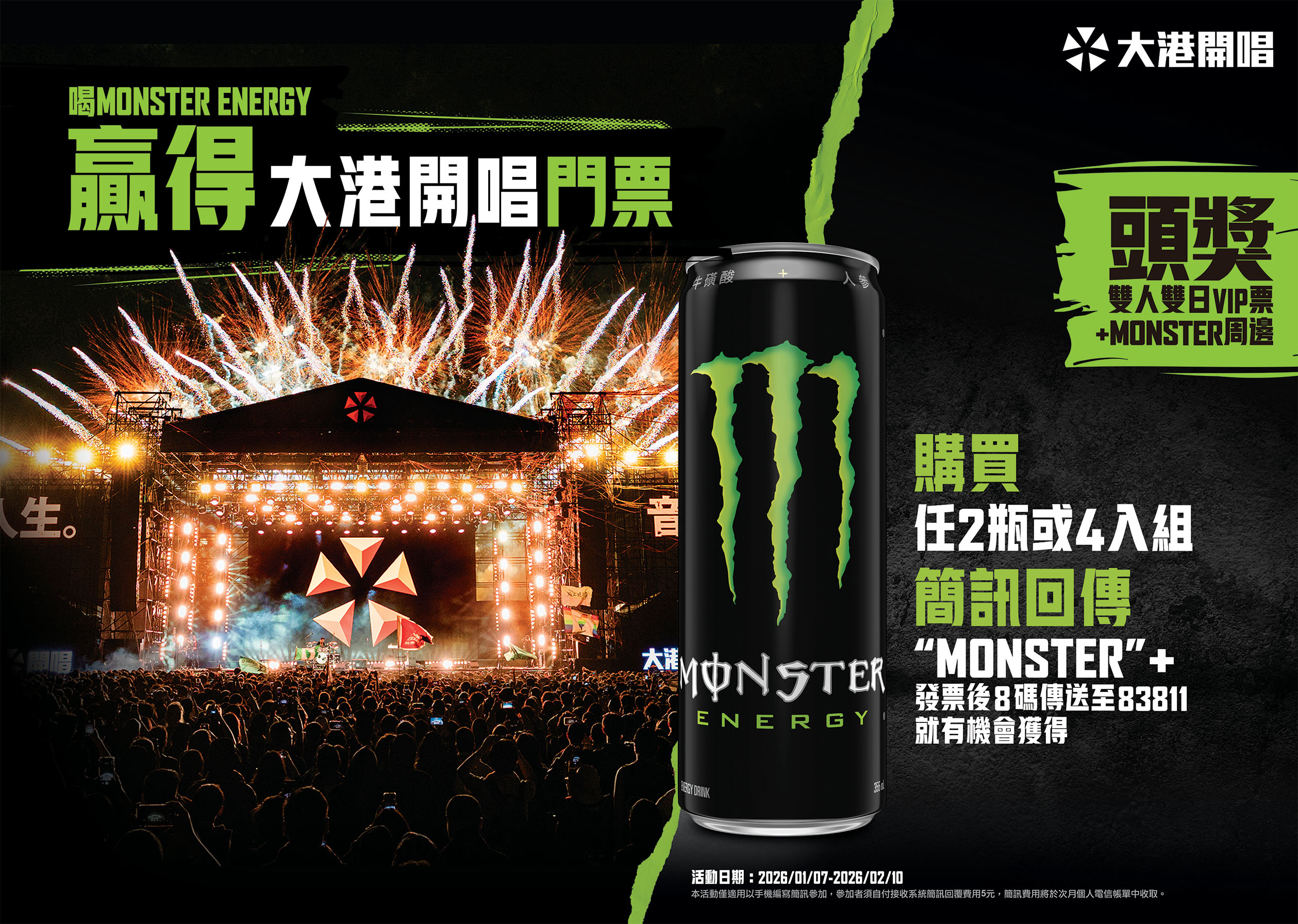 活動期間於全通路單筆發票購買Monster Energy® 全系列 (魔爪/超越/芒果狂歡/管浪潘趣/超越仙境/超越蜜桃閃耀/澳式檸檬)任兩罐或四入組,手機編寫簡訊『MONSTER+發票後八碼』傳送到83811就有機會抽中大港開唱門票及Monster Energy周邊!