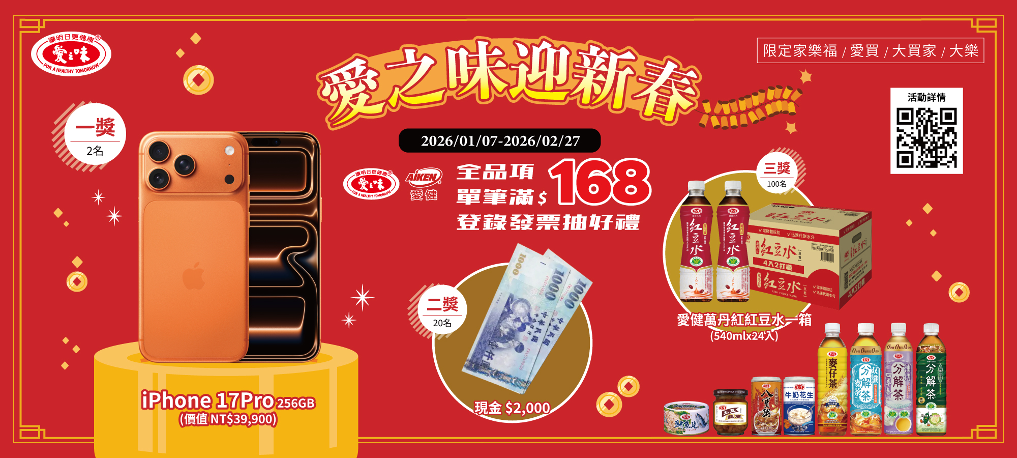 購買「愛之味/愛健」全品項(不含麥仔茶鋁箔包、莎莎亞鋁箔包),單筆發票金額折扣後滿168元,於活動網站登錄發票,即可參加抽獎。
