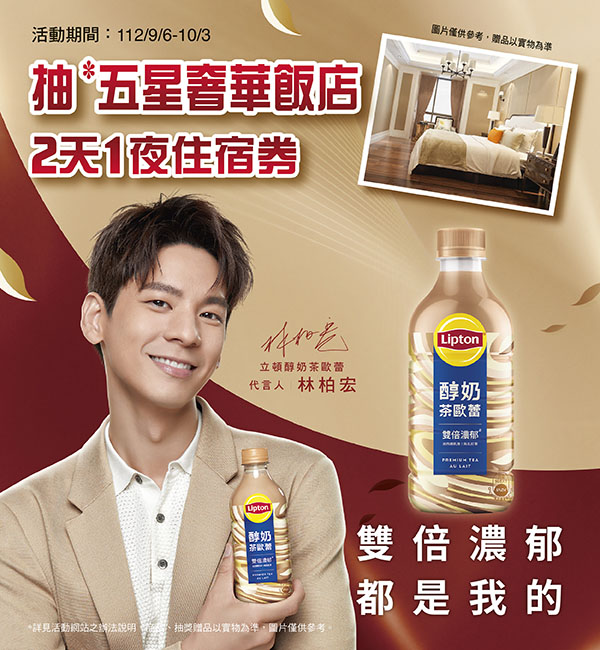 活動期間內於全家便利商店單筆購買立頓常溫即飲茶任2瓶(限鋁箔包、寶特瓶商品),至活動網站登錄發票參加抽獎,就有機會抽中五星奢華飯店2天1夜雙人住宿券!