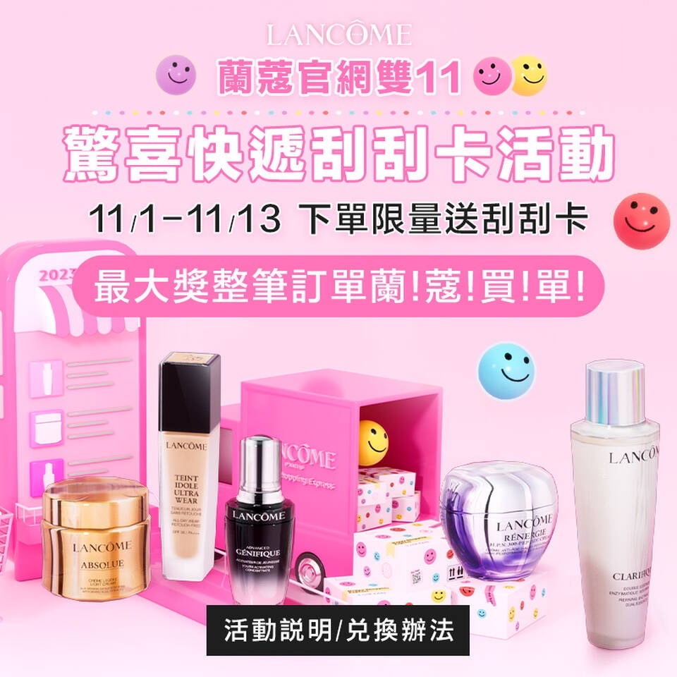 於活動指定期間,至蘭蔻官方網站消費滿額$6,111,即可獲得雙11驚喜快遞刮刮卡,每筆消費限贈送乙張,刮刮卡數量有限送完為止。