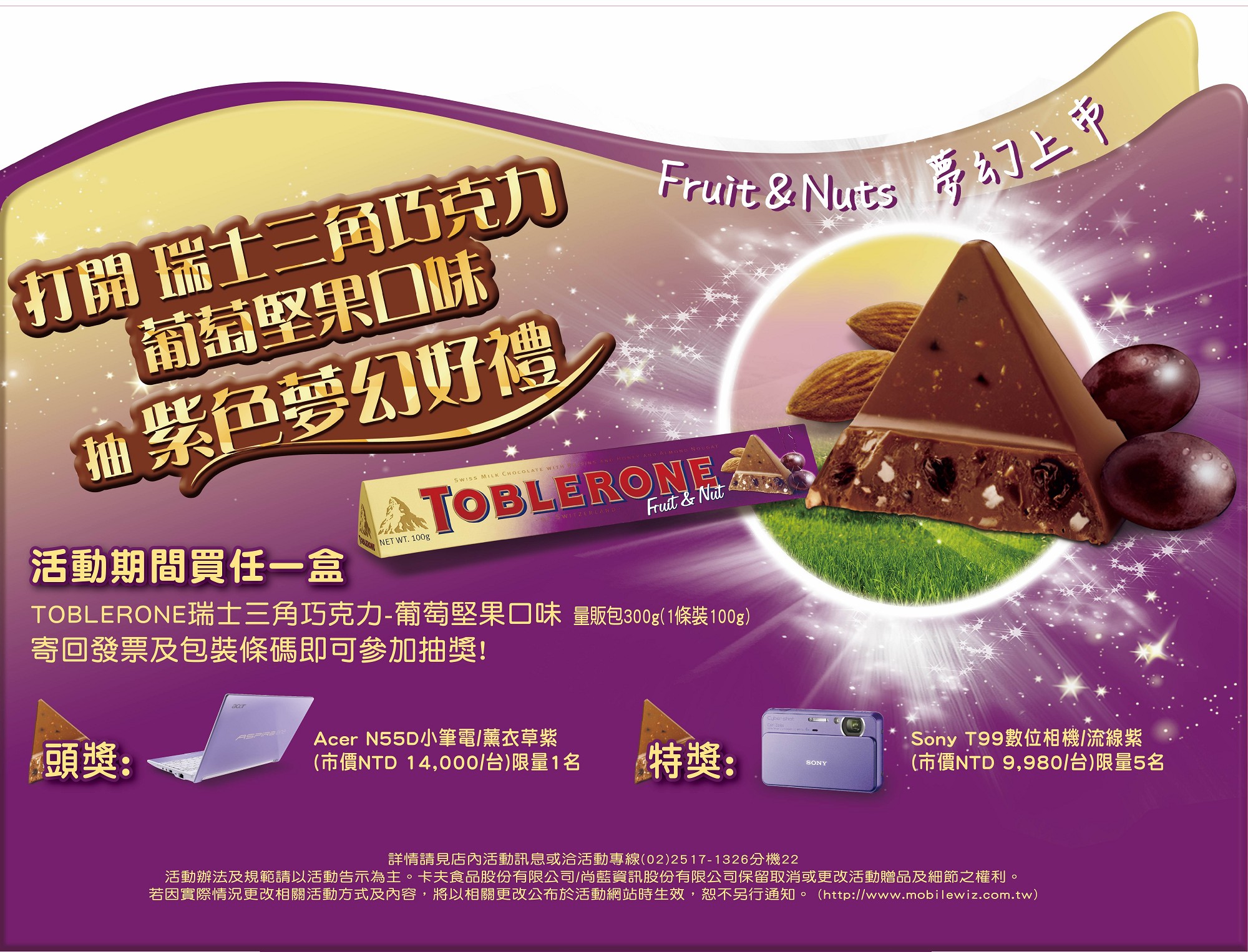 活動期間於量販通路購買TOBLERONE葡萄堅果口味三角巧克力300g量販包或超市通路買100g,寄回發票加條碼至台北郵政101-194號信箱即可參加好禮抽!